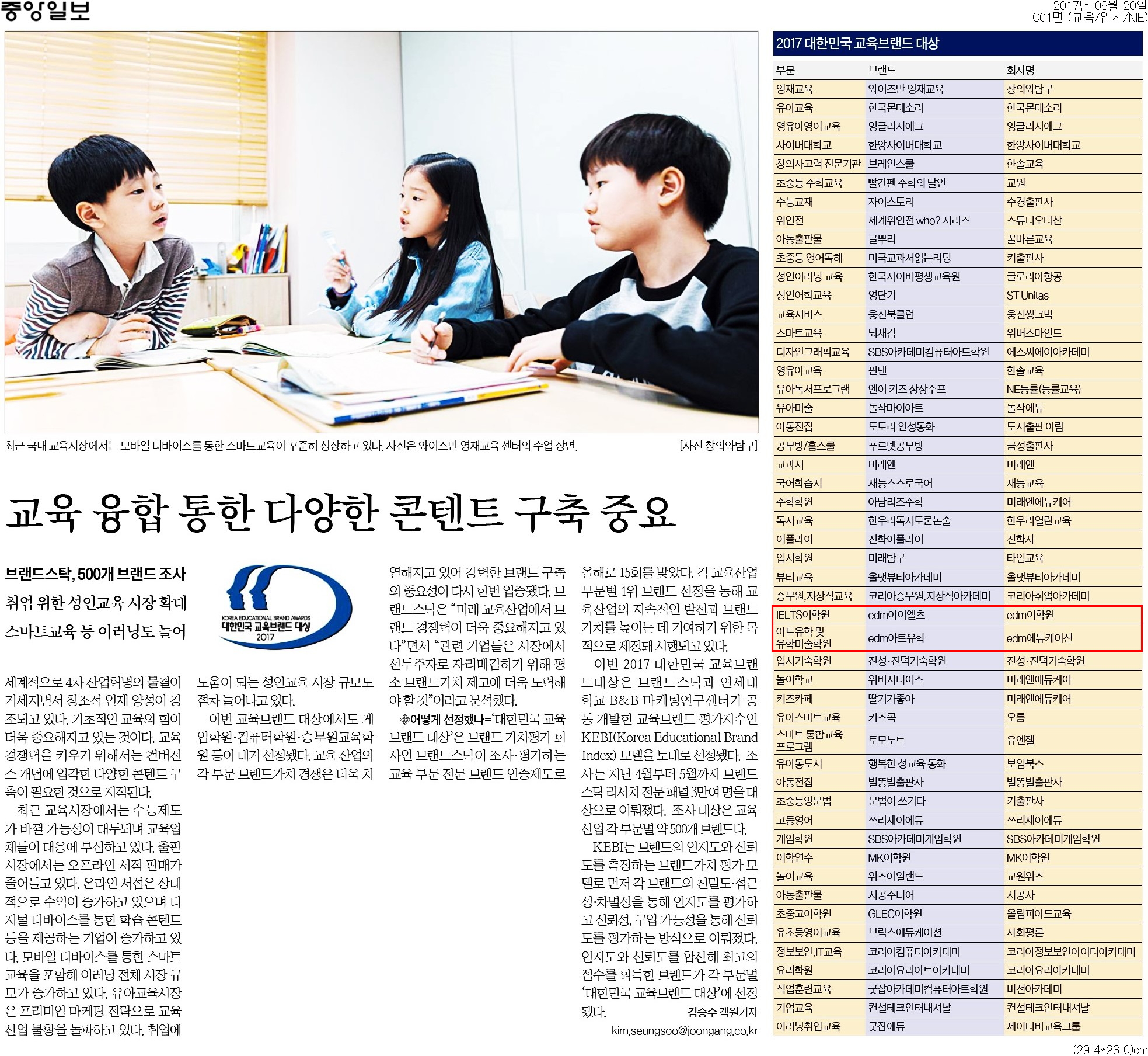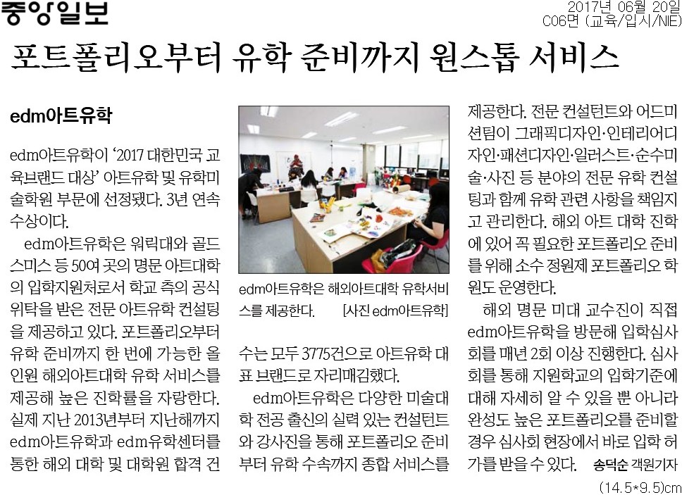 edm아트유학은 워릭대와 골드스미스 등 50여 곳의 명문 아트대학의 입학지원처로서 학교 측의 공식 위탁을 받은 전문 아트 유학 컨설팅을 제공하고 있다. 포트폴리오부터 유학 준비까지 한번에 가능한 올인원 해외아트대학 유학 서비스로 높은 진학률을 자랑한다. 실제로 2013년부터 2016년까지 edm아트유학과 edm유학센터를 통한 해외 대학 및 대학원 합격건수는 총 3,775건으로 명실공히 아트유학 대표 브랜드로 자리매김했다.
