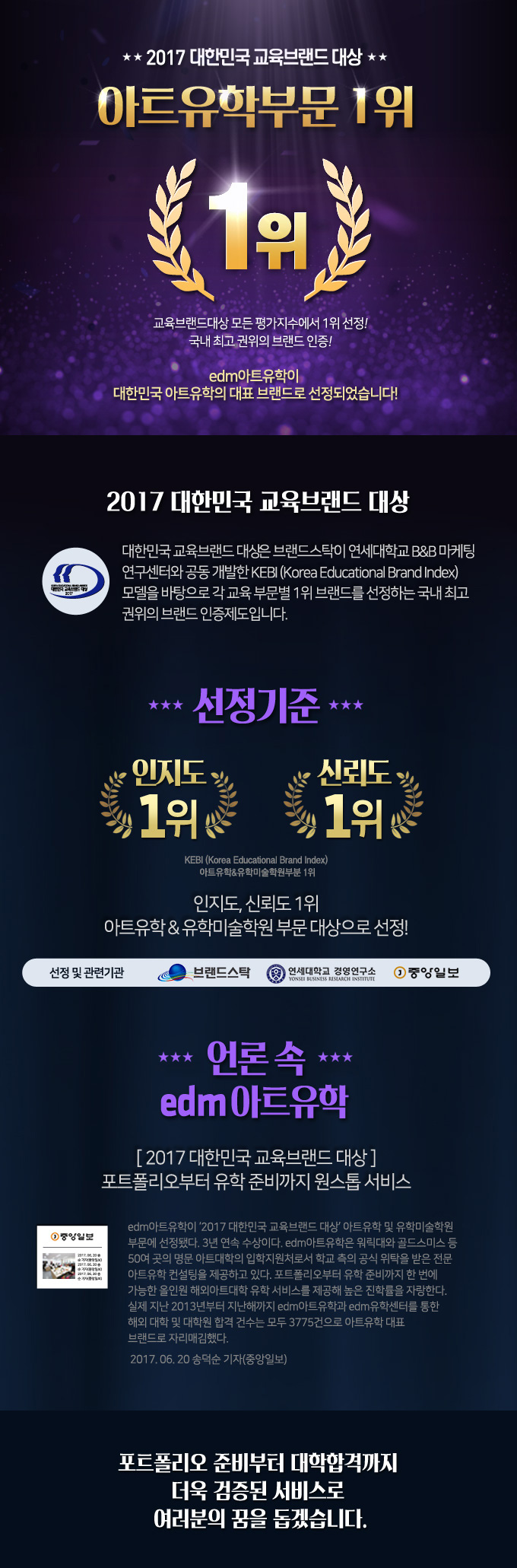 edm아트유학이 '2017 대한민국 교육브랜드 대상' 아트유학 및 유학미술학원 부문에서 3년 연속 수상하였습니다.