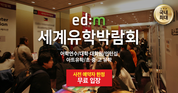 이와 함께 참석자 전원 100% 선물 증정, 수속비 할인(국가 및 과정별 상이), 출국 일정 무료 변경 혜택도 누릴 수 있다. 박람회는 edm세계유학박람회 홈페이지를 통해 사전 참가신청 시 무료로 참가 가능하다.