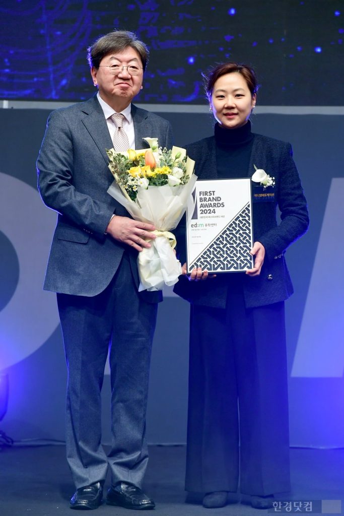 한국소비자브랜드위원회가 주최하고 한국경제신문사와 한국소비자포럼이 공동 주관한 '2024 대한민국 퍼스트브랜드 대상 시상식'이 9일 오후 서울 장충동 신라호텔에서 열렸다. 유학기업 부문을 수상한 이디엠에듀케이션(브랜드명 edm유학센터) 안지애 실장(오른쪽)이 이남식 한국소비자포럼 자문위원장과 포즈를 취하고 있다.