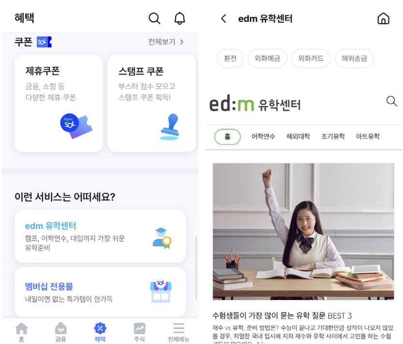 유학과 해외 여행 서비스도 담았다. 슈퍼솔에서는 edm유학센터를 통해 별도의 앱 이동 없이 유학 비용과 준비 등 관련 정보를 만나볼 수 있다. 또 멤버십 전용몰로 쇼핑은 물론 항공사 마일리지 전환, 유학할인 쿠폰 등을 지원하는 여행플러스 서비스도 제공한다.
