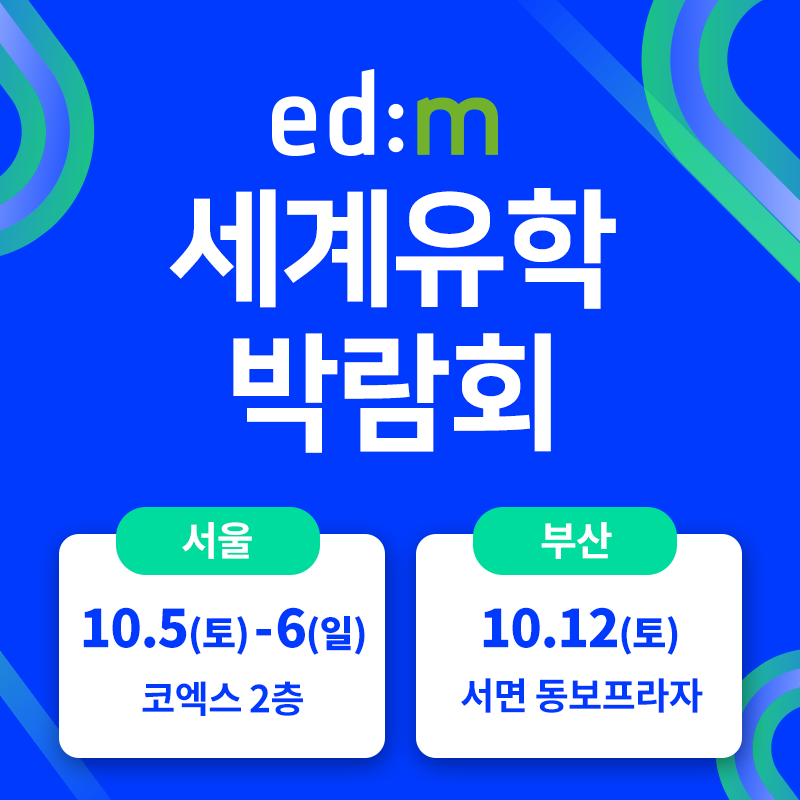 ‘edm세계유학박람회’는 누적 방문객이 5만명이 넘는 국내 최대의 유학 전문 박람회이다. 미국, 영국, 캐나다 등의 해외 명문 교육기관 교수와 담당자들이 대거 내한하여 상담을 진행한다.