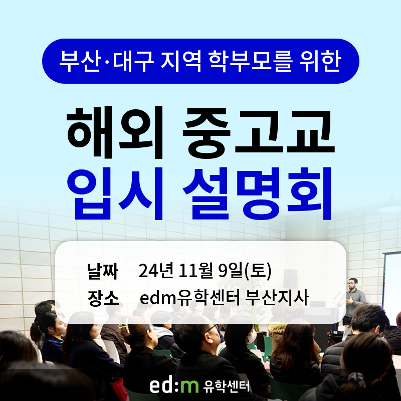 edm유학센터 부산지사의 '해외 중고교 특별 입시설명회'에 대한 자세한 내용 확인 및 참가 신청은 홈페이지를 참조하면 된다.