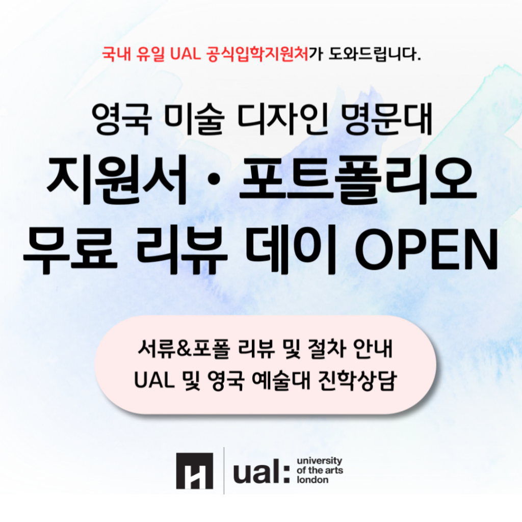 이번 리뷰데이 행사는 2025년 영국 미술디자인 명문 대학교에 유학을 준비중인 지원예정자를 위한 것으로, △ 50만원 상당의 UAL 및 영국 아트대 지원 서류 무료 검토 △ UAL 파운데이션 과정 입학심사비 면제 △ 영국 미술디자인 대학교 유학을 위한 1:1 무료 상담이 진행된다.