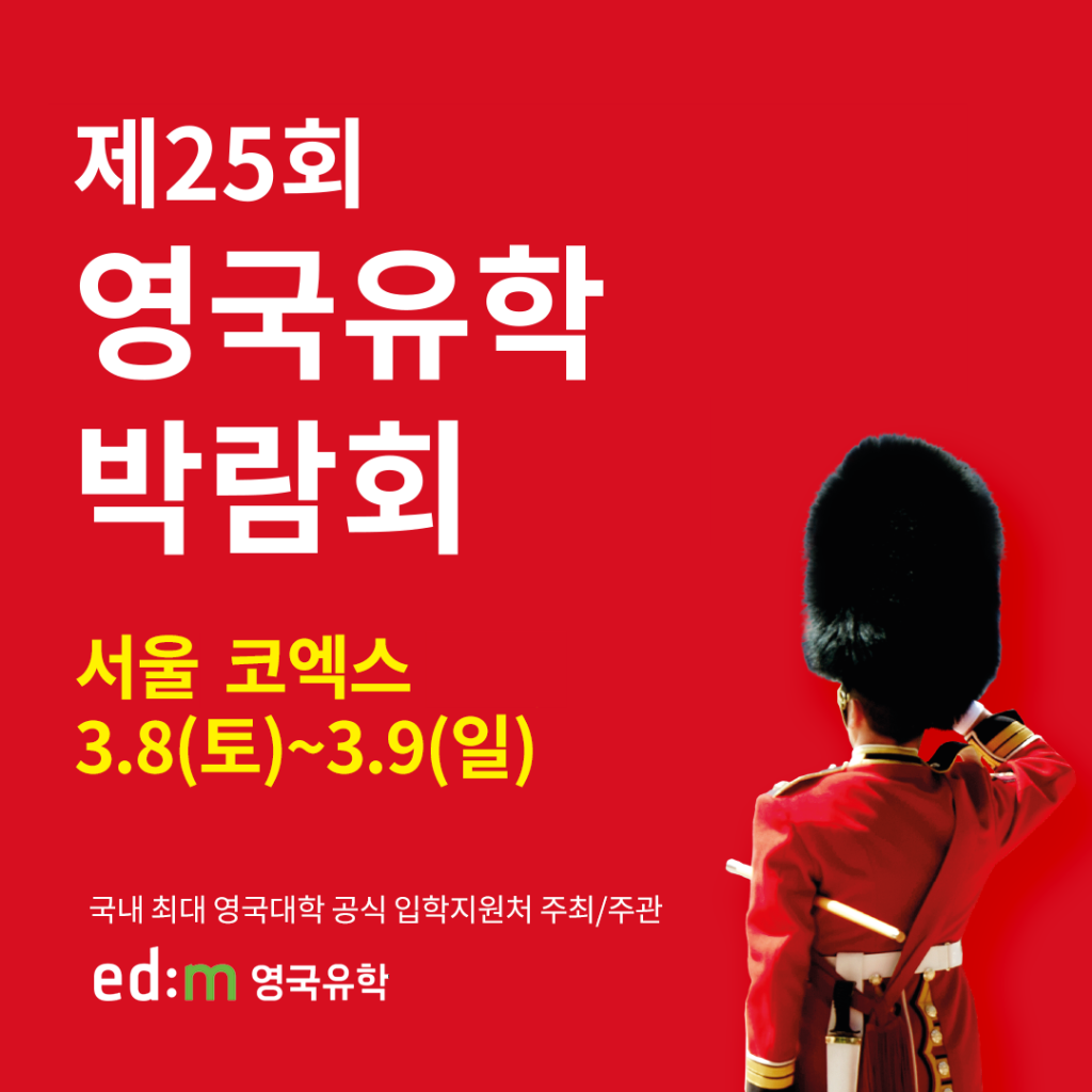 edm유학센터(대표 서동성)가 제25회 '영국유학박람회'를 서울 코엑스에서 오는 3월 8일(토)~9일(일)에 개최한다.