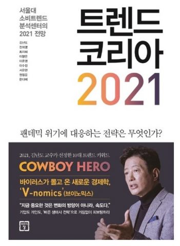 『트렌드 코리아 21』은 팬데믹 속에서도 평정심을 유지하자는 뜻, 백신의 기원이 된 소의 해, 현실을 직시하되 희망을 잃지 말자는 의미에서 COWBOY HERO를 2021의 10대 트렌드 키워드로 선정했다. 날뛰는 소를 마침내 길들이는 멋진 카우보이처럼, 시의적절한 전략으로 팬데믹의 위기를 헤쳐나가기를 기원하는 뜻을 담았다. 이번 10가지 트렌드의 전반적인 흐름을 설명할 때 가장 먼저 눈에 띄는 부분은 모든 트렌드가 코로나 사태의 영향에서 자유롭지 못하다는 점이다. 트렌드는 사회의 반영이기에 매우 당연한 일이다. 본서의 첫 키워드인 브이노믹스V-NOMICS는 바이러스VIRUS의 V에서 출발한 단어로 “바이러스가 바꿔놓은, 그리고 바꾸게 될 경제”라는 의미다. 과연 V자 회복은 가능할까? 기존의 가치VALUE는 어떻게 변할까? 언택트 트렌드의 진화는 어디까지인가? 새로운 브이노믹스 패러다임에 얼마나 잘 적응하느냐가 장기화될 코로나 시대를 이겨내는 전략을 제공할 것이다.