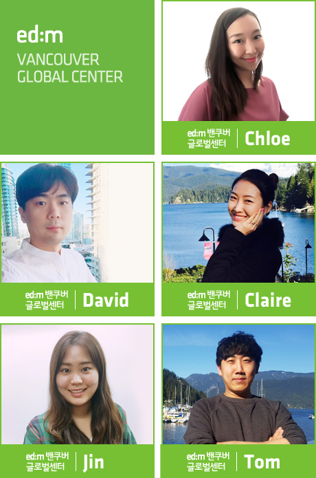 Tom : 밴쿠버는 유학 생활을 하면서 동시에 여행도 즐길 수 있는 곳으로 다양한 추억을 만들어 갈 수 있습니다. 지금 한국에서 준비하시는 모든 분들 ed:m 밴쿠버 글로벌센터가 성공적인 유학 생활을 도와드리도록 하겠습니다. 밴쿠버에서 뵙겠습니다! ^^