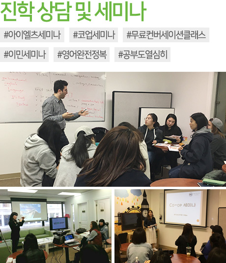 David : 저희 밴쿠버 센터에는 학생들에게 제공하는 다양한 세미나가 있어요. 앞으로도 더 유익하고 좋은 세미나가 있을 예정인데요. 텍스 문화인 캐나다에서 환급받을 수 있는 텍스리턴 세미나, 통번역&아이엘츠 세미나, 캐나다 워킹홀리데이 세미나, 많은 경험을 할 수 있는 봉사활동 세미나 등 새롭고 다양한 세미나 기대해 주세요.