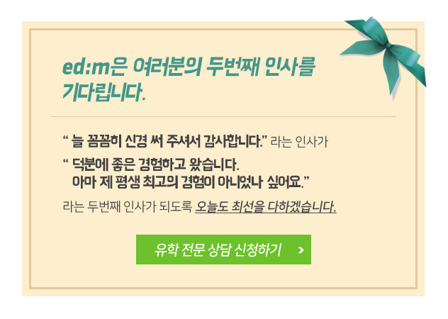 바쁜 업무 중, 시험 준비까지 하느라 정신 없겠지만 유학전문가 과정은 컨설턴트로서의 전문성 및 역량을 드러낼 수 있는 기회입니다. 고객을 향한 정성으로써, 고객에게 최고의 유학을 선물하고 우리의 컨설팅 퀄리티를 함께 높이는 것인 만큼 좋은 마음으로 열심히 준비하시면 좋겠습니다.^^