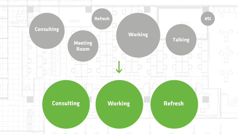 이전보다 업무환경이 복잡해 지고, 직무가 다양해지면서 조직 및 개인간의 소통의 중요성이 높아지고 있습니다. 다양한 프로젝트를 효율적으로 추친하기 위해서는 여러 부서의 구성원과의 긴밀한 협업이 필요합니다. 하지만 공간은 한정되어 있기 때문에 다양한 협업의 목적에 맞는 공간을 조성하기 위해서는 한정된 공간을 효율적으로 활용할 수 있어야 했습니다.