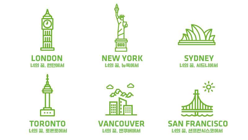 ‘꿈꾸게 하고 싶다’라는 메시지를 던지기로 했습니다. ‘너의 꿈 런던에서’, ‘너의 꿈 뉴욕에서’… 등의 문구와 함께 각 도시의 랜드마크를 직접 그려 edm 특유의 친근함을 표현했습니다.