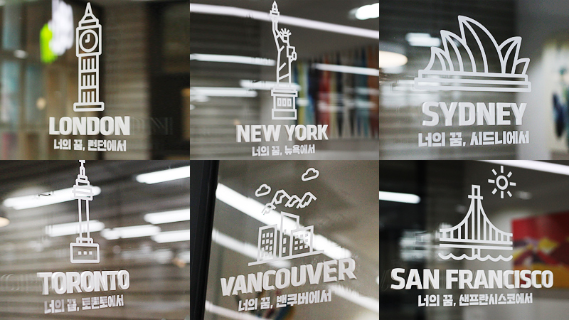 상담실 입구 사이니즈 디자인, 각 도시의 랜드마크 일러스트로 친근함을 표현