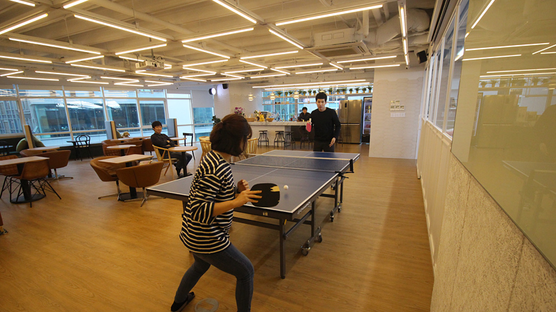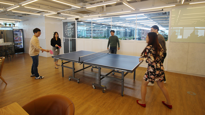 인기가 많은 탁구, 매일 계속되는 탁구게임으로 직원들의 탁구 실력은 상승하고 있습니다.