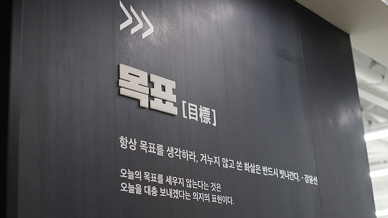 본사 업무 공간 쪽으로 돌아오는 벽면에 붙어 있는 문구 ‘목표’