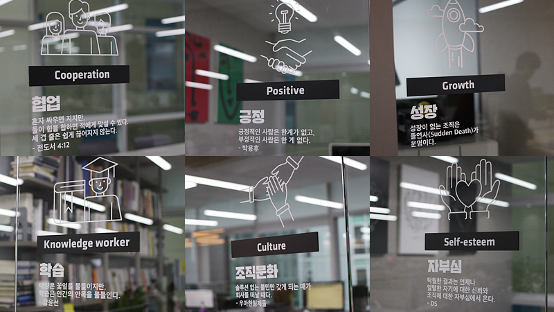 본사 확장 이전 프로젝트를 진행하면서 가장 많이 고민한 것은 공간에 의미를 부여하는 것이었습니다. 직원들이 가장 많이 이용하는 곳에 edm의 핵심가치를 표현하여 일상속에서 동기부여를 하자는 생각이 모아졌습니다. 이러한 아이디어를 적용한 곳이 본사 출입구와 회의실입니다.