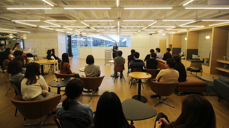 마당은 공연과 강의 교육이 가능하도록 설비를 갖추고 있습니다. 이 곳은 컨퍼런스, 독서모임, 강의장 등의 회사 내부 행사를 위해 사용되어 다양한 교육 컨텐츠를 직원들과 공유할 수 있는 공간으로 활용되고 있습니다.