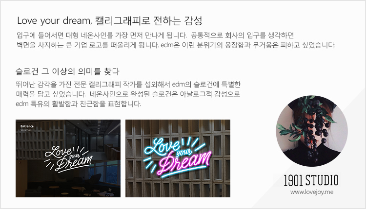 비전과 철학을 담아 내기 위해 고려되어야 할 사항은 다양한 공간과 시설 등이 모두 edm이 지향하는 브랜딩 철학과 일관성 있게 적용되어야 했습니다. 각각의 공간속에 edm의 핵심가치를 녹아내는 방법을 고민하며 기획했습니다.